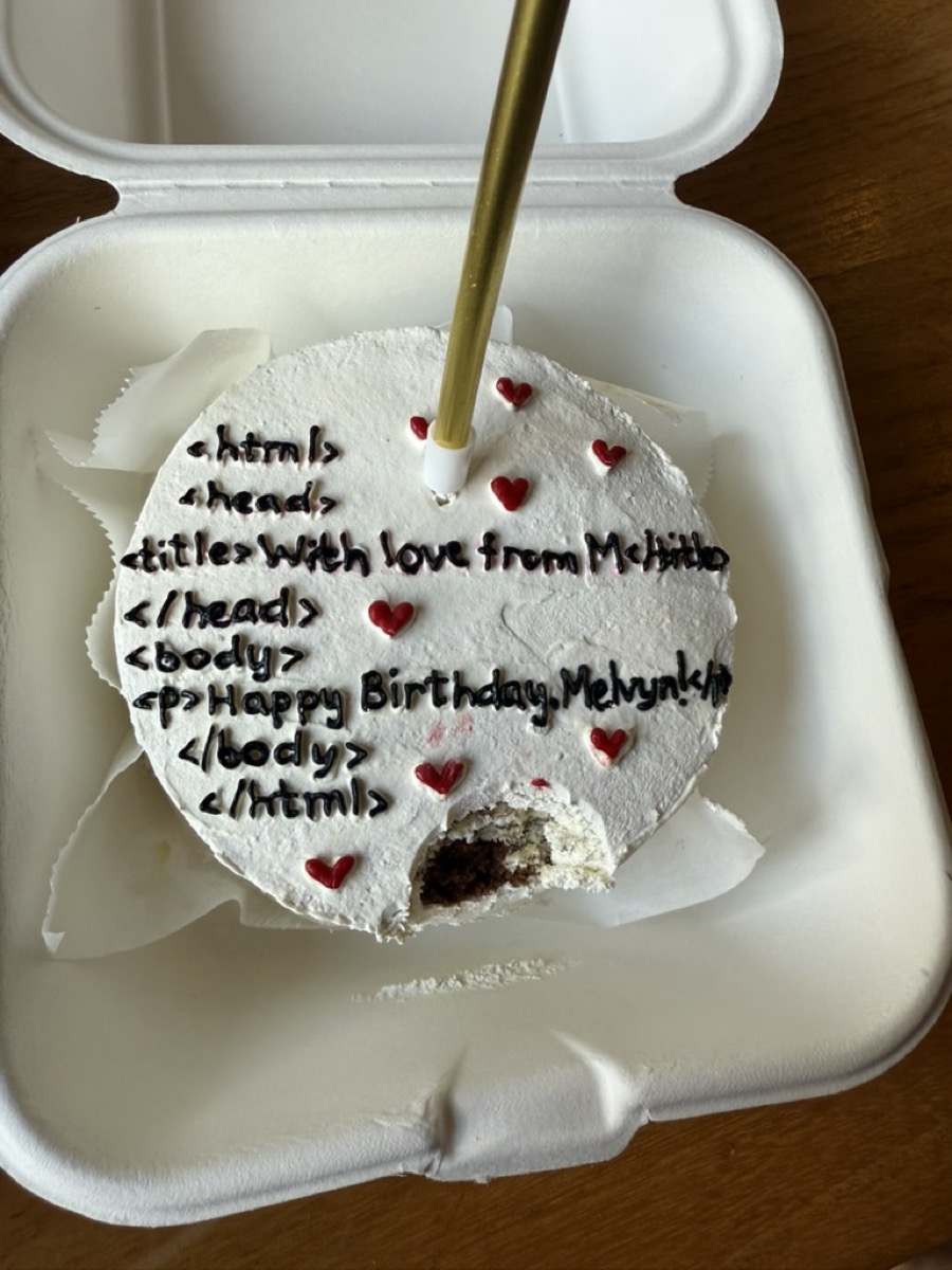 Début mai, il a fallu préparer cet anniversaire. C'était un peu le rôle de ma copine de venir organiser tout ça. Et elle m'a fait un super gâteau avec du code dessus. C'était trop joli, avec du HTML "Happy Birthday Melvyn" :