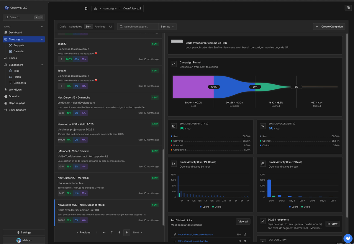 J'essaie d'envoyer des dizaines de milliers d'emails. Je commence à avoir de vrais utilisateurs sur Lumail. Et je commence vraiment à voir que l'outil a un potentiel énorme. Ça me fait kiffer.
